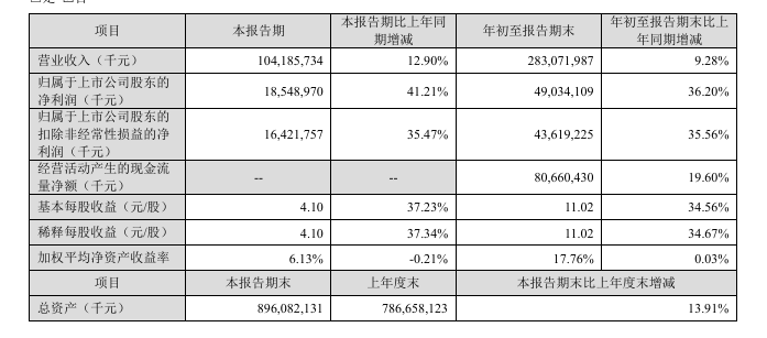 前三季度,公司营收2830.72亿元,同比增长9.28%,归母净利润490.34亿元同比增长36.20%前三季度盈利接近去年全年利润。