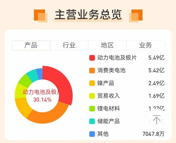 报告显示,公司主营业务为动力电池及极片5.49亿,消费类电池5.42亿,镍产品2.49亿,贸易收入1.69亿,锂电材料1.27亿,储能产品1.15亿,其它7047.8万。