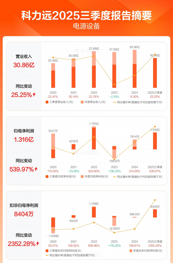 10月28日晚间,科力远发布2025年三季报,前三季度营业收入30.86亿元,同比增长25.25%;归母净利润1.32亿元,同比增长539.97%,相当于去年全年净利润的6倍。