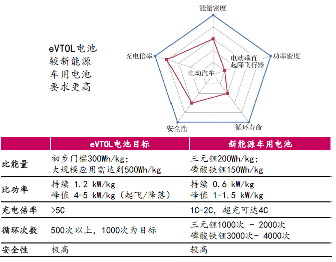 综合来看,eVTOL电池相较新能源车用电池在比能量、比功率、充电倍率、循环次数与安全性五大维度上都提出了更高的要求