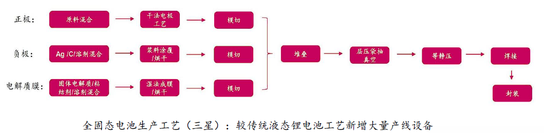 全固态电池需全新干法/真空镀膜/UV固化产线,较现有液态电池产线新增大量设备,且原先辊压、叠片等设备也需要升级;单GWh产线投资可达4-5亿元,是液态电池产线的2-3倍。