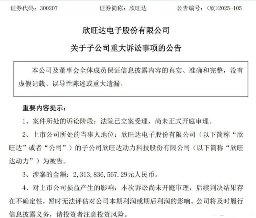 2025年12月,欣旺达发布的《关于子公司重大诉讼事项的公告》(公告编号<欣>2025-105)显示,子公司欣旺达动力已被威睿电动起诉,涉案金额达23.14亿元,法院已立案但尚未开庭。