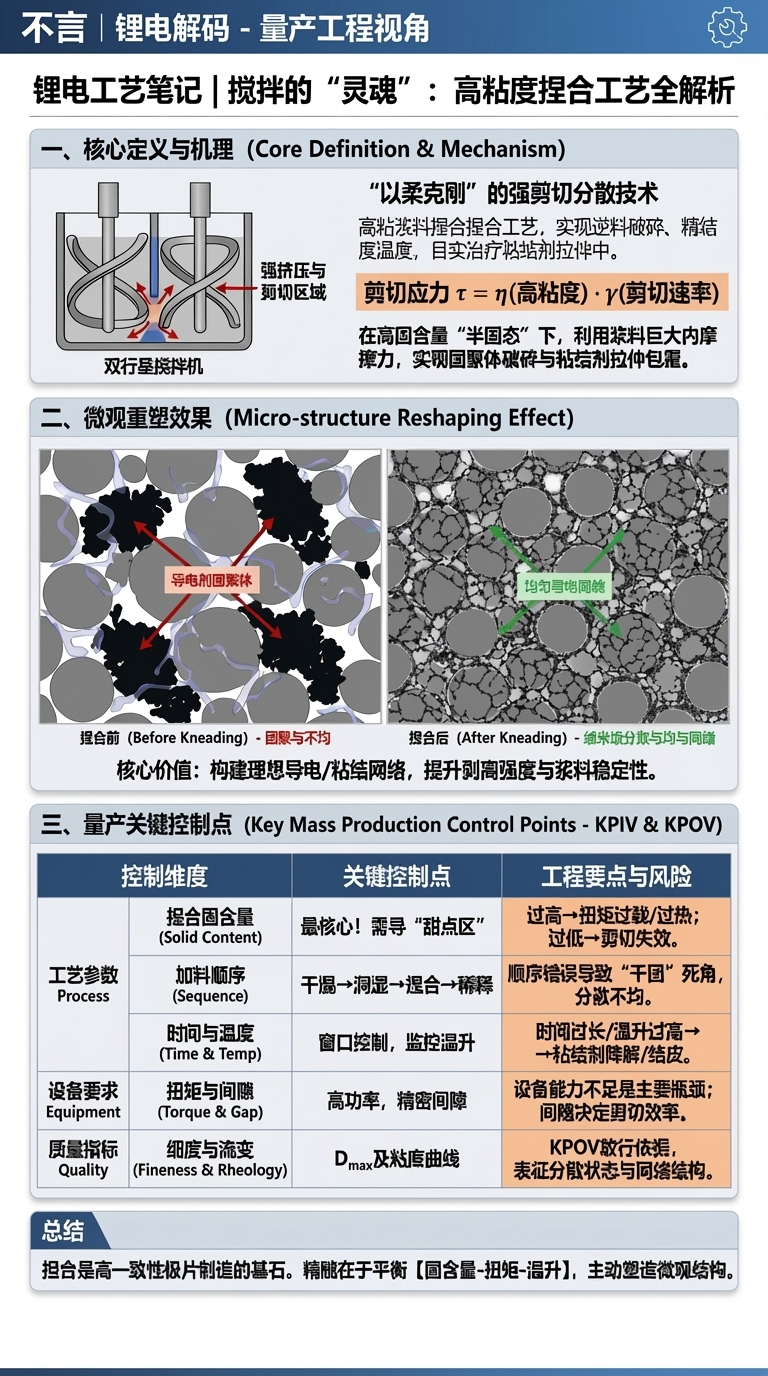 锂电搅拌工序的“灵魂环节”——高粘度捏合工艺全解析大家好,我是不言,这是我的第202篇原创文章。在锂电池极片制造中,如果说搅拌是第一道关口,那么捏合工艺(Kneading)就是这道关口的“灵魂环节”。它不仅决定了浆料