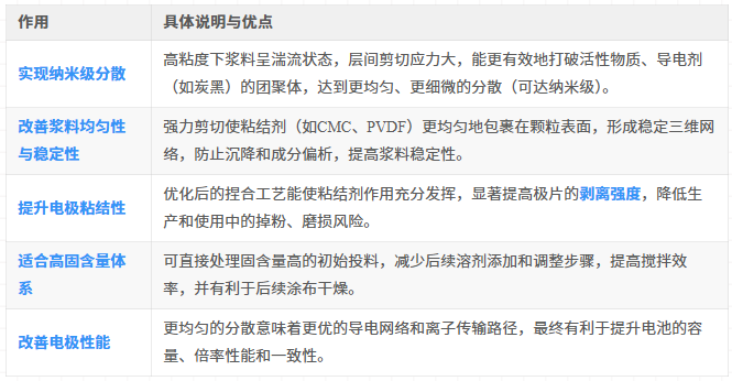 工艺对比与传统“常规分散工艺”(依靠浆料流动和颗粒布朗运动进行低速分散)不同,捏合工艺主动施加更大的机械能。