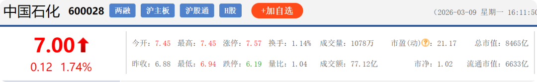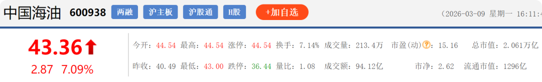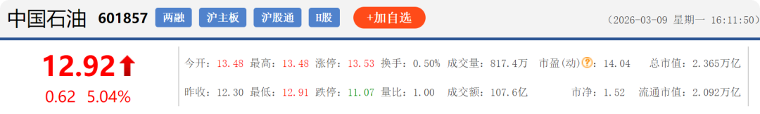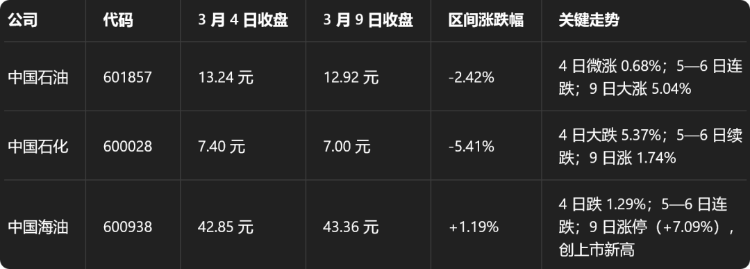 3月4日至3月9日,“三桶油”整体呈现先大幅回调、再连续下跌、最后受国际油价暴涨带动强势反弹的走势,其中中国海油弹性最大、中国石油次之、中国石化相对稳健。三家最新市值为中国石油2.365万亿元、中国石化8465亿元、中国海油2.061万亿元,值得一提的是在3月9日,三桶油股价均出现不同程度的上涨,其中以中国海油7.09%的涨幅最高,中国石化仅上涨1.74%。