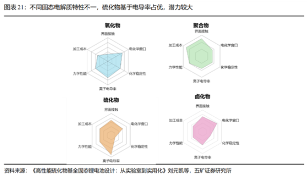 五矿证券指出基于电导率这一核心优势,硫化物为主的固态电解质成为企业较多选择,潜力较大。从四类主流电解质上看,聚合物电解质最早商业化,但室温离子电导率一般,性能潜力有限;氧化物化学稳定性强,但电导率一般,界面接触较差;卤化物化学稳定性较好,但导电率不够好;硫化物导电率好,但化学稳定性一般。从物理学上看,固态电解质本质是提供电导率,替代隔膜和电解液,电导率是核心指标。而硫化物离子电导率最接近液态电解质。宁德时代、比亚迪等企业均是硫化物为主的技术方案。