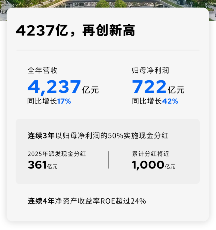 3月9日晚,全球动力电池龙头宁德时代(300750.SZ,03750.HK)披露的2025年年度报告显示,公司实现营业收入4237.02亿元,同比增长17.04%;归母净利润为722.01亿元,同比增长42.28%。