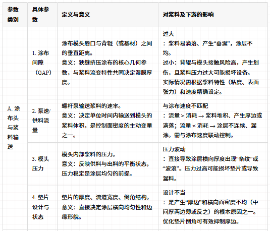 过程参数是实现产品参数的“控制手段”。涂布工序的难点在于参数间存在强耦合性,所有变量必须维持在特定的“涂布窗口(Coating Window)”内,才能确保制程稳定。